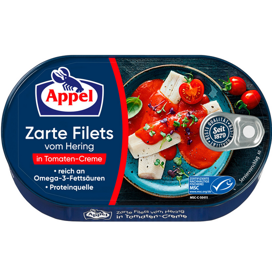 Appel MSC zertifizierte zarte Heringsfilets in einer Creme aus aromatischen sonnengereiften Tomaten.