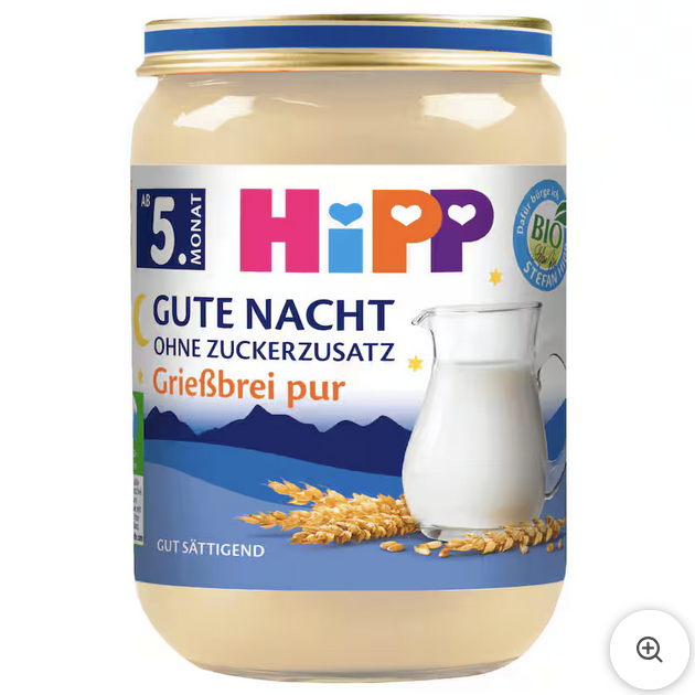 HiPP Gute Nacht Grießbrei pur ist ein vollwertiger Abendbrei im Glas aus babygerechter Milchzubereitung und Getreide - ganz ohne Zuckerzusatz. Die Produkte sättigen besonders gut und sind somit die ideale Abendmahlzeit vor dem zu Bett gehen. Mit Vitamin A, B1, D und Calcium.