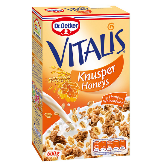 Vitalis Knuspermüsli Honeys sind mit Bienenhonig und köstlichen Weizenpops knusprig gebacken und lecker verfeinert. So schmecken Vitalis Knuspermüsli Honeys mit der original Vitalis-Knusperqualität leicht und locker. Ein besonderes Röstverfahren lässt sie schön knusprig bleiben. Dr.Oetker Vitalis Knuspermüsli Honeys liegen im Verbrauchertrend und sorgen mit ausgesuchten Rohstoffen und raffinierter Rezeptur für einen genussvollen Start in den Tag. Vitalis- Genuss, der gut tut.