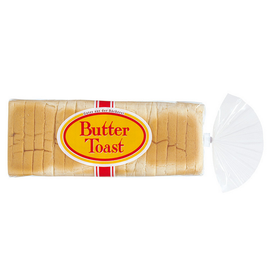Buttertoast. Zarter Toast mit 5 Kg Butter auf 100 Kg Mehl gebacken.