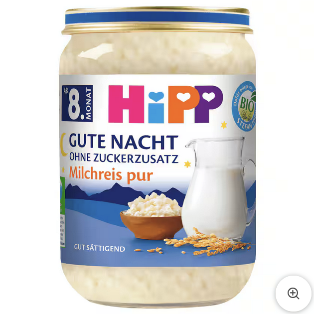 HiPP Gute Nacht Milchreis pur ist ein vollwertiger Abendbrei im Glas aus babygerechter Milchzubereitung und Getreide - ganz ohne Zuckerzusatz. Die Produkte sättigen besonders gut und somit die ideale Abendmahlzeit vor dem zu Bett gehen. Mit Vitamin A, B1, D und Calcium.