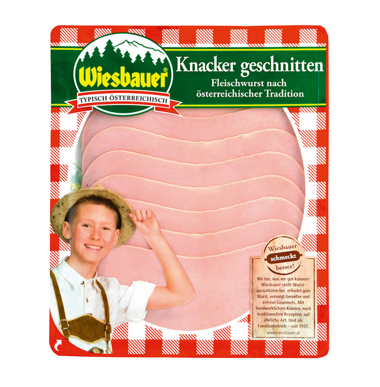 Fein aufgeschnittene, klassische Knacker für’s Brötchen oder für die klassische Vorspeise in Essig und Öl. Kräftiger, fleischiger Biss und feine Gewürze ergeben den legendären Geschmack.