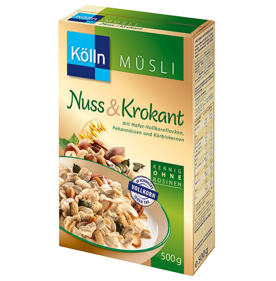 Vollkorn-HAFERflocken (67 %), NUSSKERNmischung (CASHEWKERNstücke, PEKANNUSSKERNstücke (2 %), gehobelte MANDELN), Vollkorn-HAFERmehl(6 %), Vollkorn-WEIZENflakes (5 %), Zucker, Sonnenblumenkerne, Karamellsirup, Kürbiskerne (2 %), gestiftelte MANDELN, gehackte HASELNUSSKERNE, WEIZENmehl, GERSTEnmalzextrakt, Maisstärke, Dextrose, Speisesalz. Hinweis für Allergiker Kann weitere Schalenfrüchte, Milch und Erdnuss enthalten.