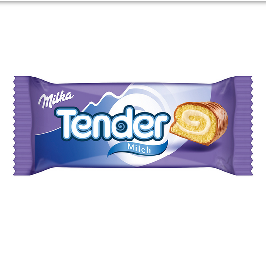 Tender Milch ist der köstlich, lockere Kuchensnack: feine Biskuit Rolle gefüllt mit leckerer Milchcrème umhüllt mit zarter Milka Alpenmilch Schokolade