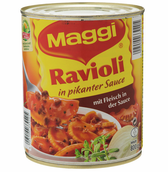 74,5% Tomatensauce [Wasser*, 20,5 % Tomatenmark*, 3% Rindfleisch*, Maisstärke*, Rinderfett*, Jodsalz (Salz, Kaliumjodat), Zucker*, 0,2% geräucherter Speck* (Speck, Salz, Rauch), Zwiebeln*, Paprika*, Würze* (aus WEIZEN), Lauch*, SELLERIE*, Pfeffer*, Salz], 25,5 % Ravioli [HARTWEIZENGRIESS*, Wasser*, WEIZENMEHL*, Paniermehl (WEIZENMEHL, Jodsalz (Salz, Kaliumjodat), Hefe), WEIZENEIWEISS*, 0,6% geräucherter Speck* (Speck, Salz, Rauch), Gewürze*, Jodsalz (Salz, Kaliumjodat), Kartoffelstärke*, Majoran*, Lorbeerblätter*]. Kann enthalten: EIER, MILCH, SENF, SOJA. *natürliche Zutaten. Anteile beziehen sich auf das Gesamtprodukt.