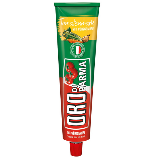 Das Tomatenmark von ORO di Parma ist eine unverzichtbare Zutat in der italienischen Küche. Das 2-fach konzentrierte Tomatenmark mit Würzgemüse aus aromatischen, sonnengereiften Parma-Tomaten und frischem Gemüse sorgt für die ganz besondere Würznote. Neben Tomaten enthält es Karotten, Zwiebeln, Sellerie und ausgesuchte Kräuter, verfeinert mit einem Hauch Öl. Dadurch eignet es sich hervorragend für rote und braune Saucen, Nudelgerichte, Fisch, Fleisch, Reis und Gemüse.