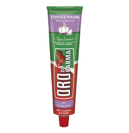 Das Tomatenmark von ORO di Parma ist eine unverzichtbare Zutat in der italienischen Küche. Im Tomatenmark mit Knoblauch steckt die volle Kraft des Knoblauchs und eignet sich damit perfekt für jeden Knoblauch-Liebhaber. Dadurch sparen Sie sich das Knoblauch schneiden! So geht original italienisch kochen ganz schnell. Dieses Produkt ist ideal für rote und braune Saucen, Nudelgerichte, Fisch, Fleisch, Reis und Gemüse und als Pizza-Belag.