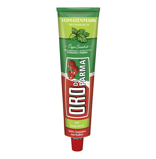 Zwei italienische Klassiker perfekt vereint: unser vollfruchtiges Tomatenmark aus Parma-Tomaten und besonders aromatischer Basilikum. Mit diesem verfeinerten Tomatenmark werden Ihre Gerichte von Beginn an original italienisch. Ideal für: rote und braune Saucen, Nudelgerichte, Fisch, Fleisch, Reis und Gemüse und als Pizza-Belag.