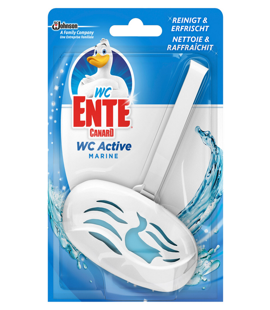 WC-Ente® WC Active WC-Einhänger ist ein WC-Spüler, der die Toilettekraftvoll reinigt. Der Toilettenreiniger sorgt für einen angenehmen Toilettenduft im gesamten Bad - für alle WCs mit Rand. Vergewissern Sie sich, dass die Toilette sauber ist bevor Sie denWC-Erfrischer einhängen. Den WC-Einhänger ausklappen und am Rand der Toilette anbringen. Das Produkt so ausrichten, dass der WC-Dufstein während des Spülvorgangs im Wasserfluss liegt.