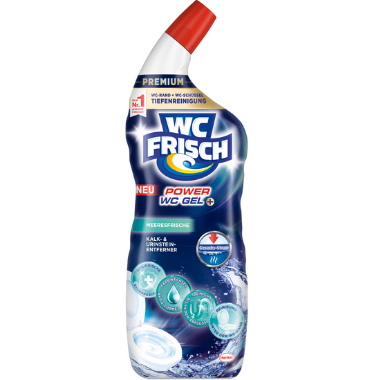 WC FRISCH Power Gel WC Reiniger Meeresfrische - Für Tiefenreinigung bis in den Abfluss & unter dem WC-Rand. Das WC FRISCH Power WC Gel Meeresfrische sorgt dank seiner starken Reinigungskraft für hygienische Sauberkeit. Mit der innovativen WC FRISCH 4-fach Kombination bietet der Toilettenreiniger hygienische Sauberkeit, hat eine Farbwechsel-Aktiv-Formel und reinigt bis in den Abfluss sowie unter dem WC-Rand.